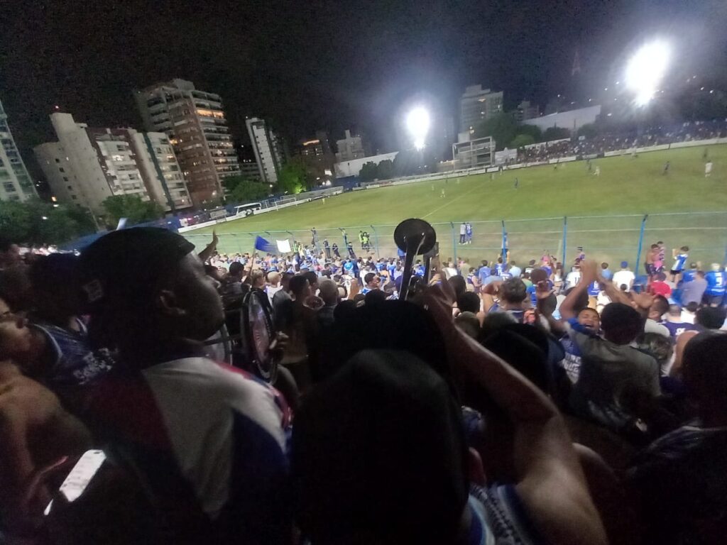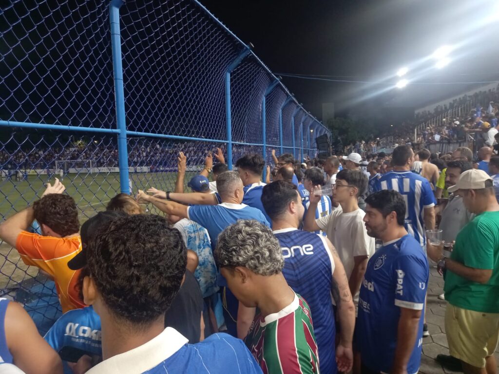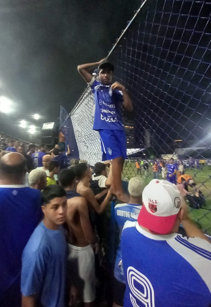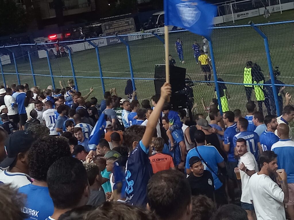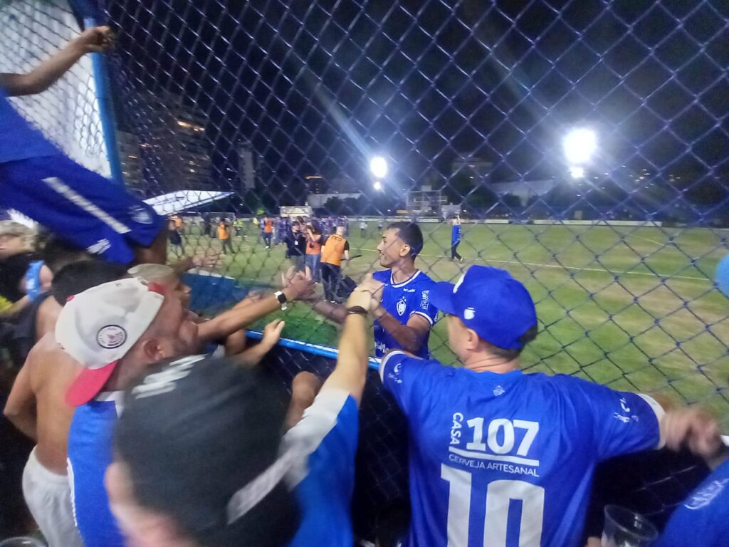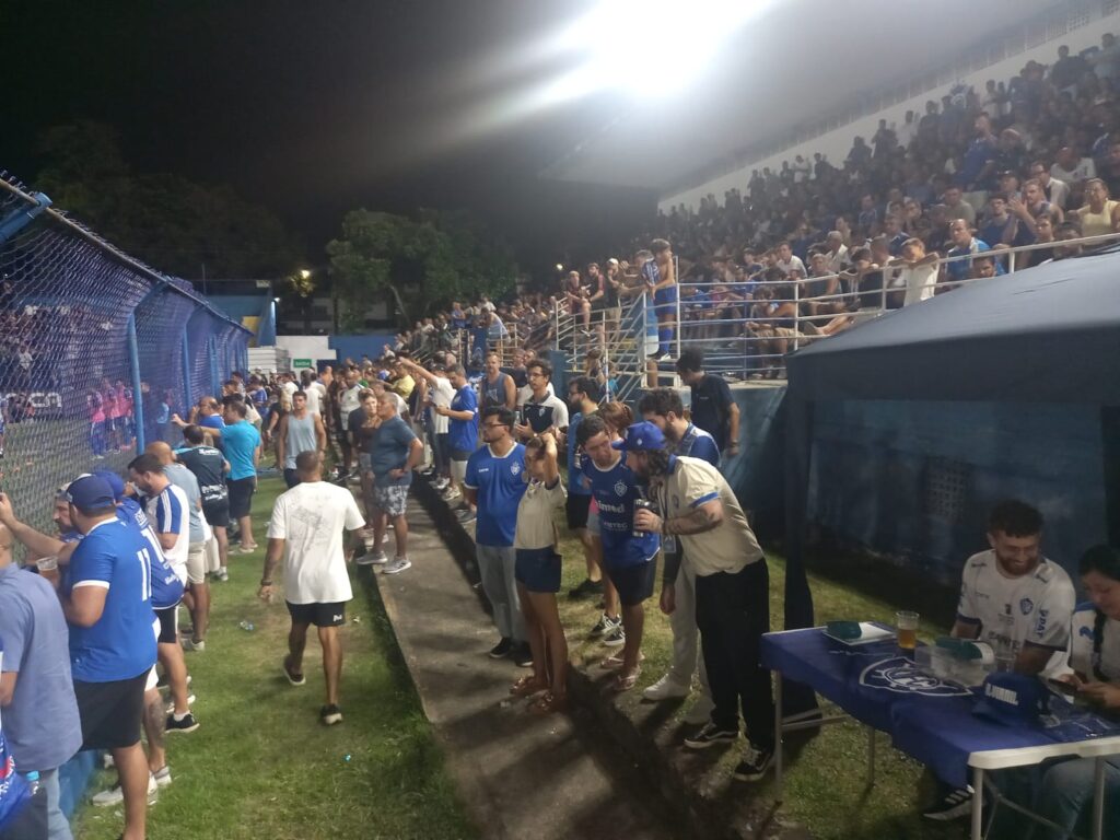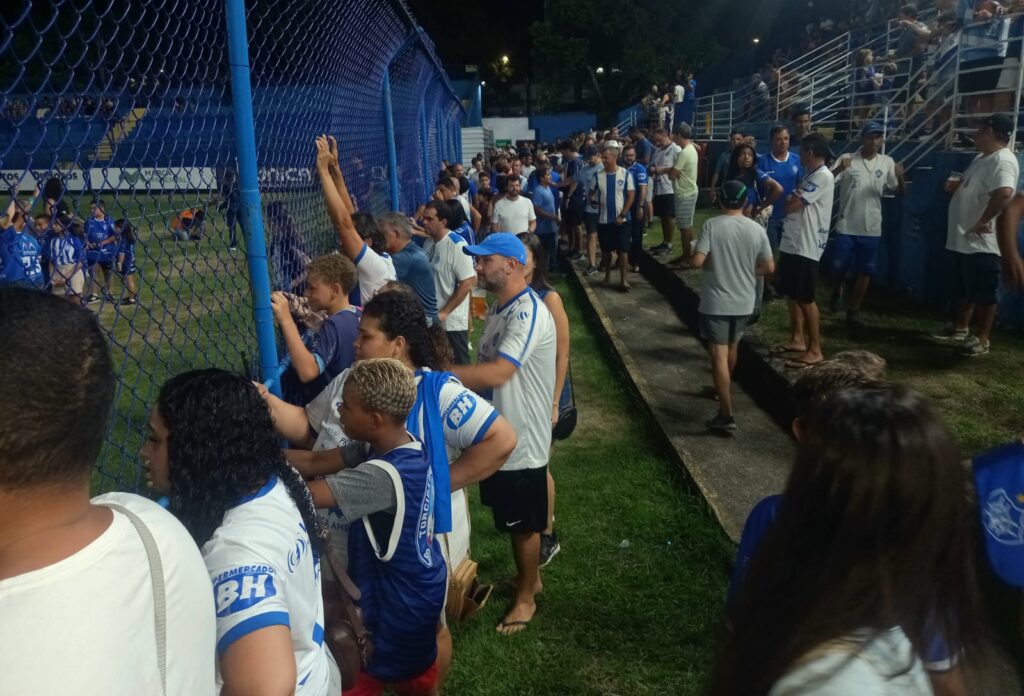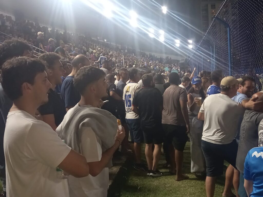 Em tese, o jogo já acabou, falta só o árbitro apitar, por isso o público e aglomera ali no alambrado…
