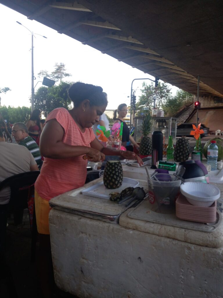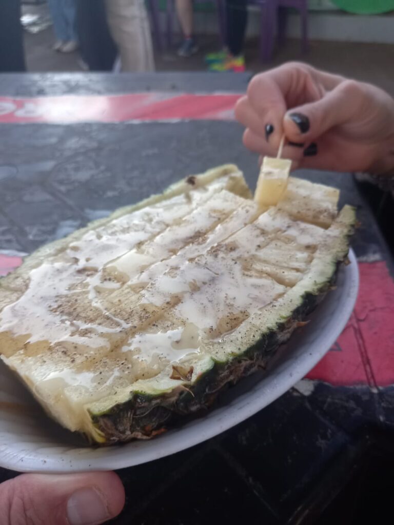 Fomos apresentados ao abacaxi temperado (alguém já conhecia de outro lugar?) que é a metade de um abacaxi servido na casca mesmo, coberta com pimenta, sal e leite condensado.