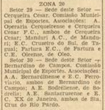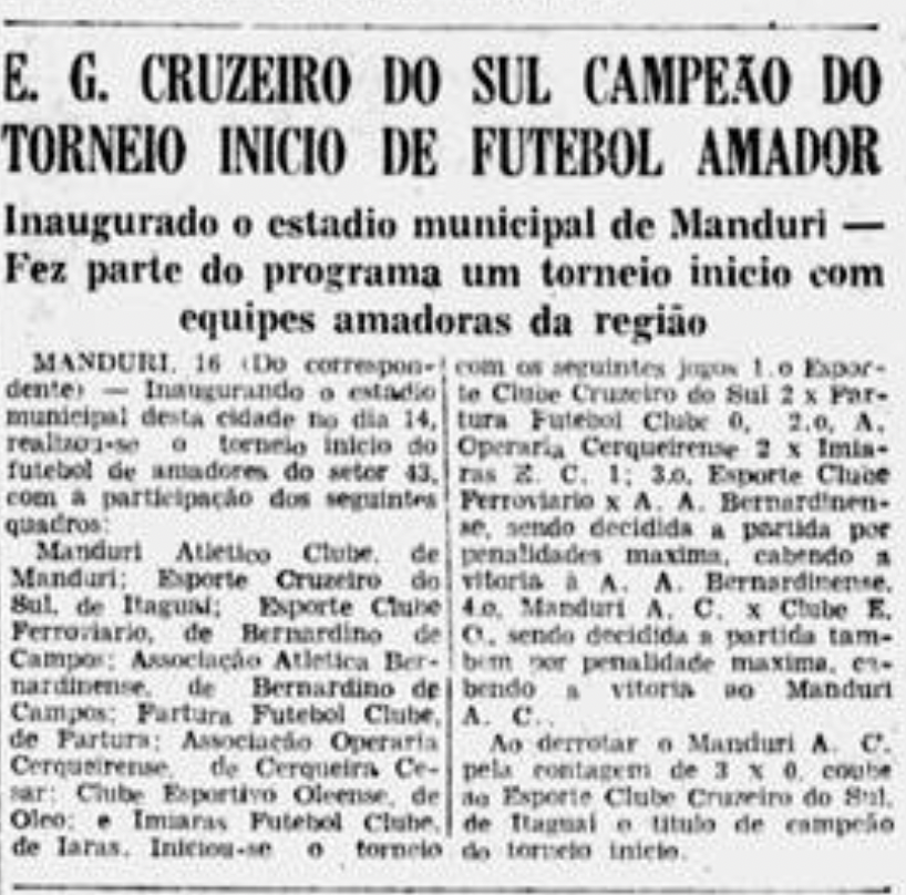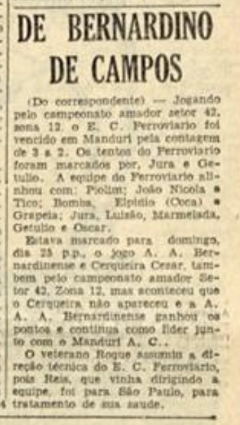 A Gazeta Esportiva de 7 de outubro de 1955 traz uma notícia relacionada ao Setor 42, zona 12 do Campeonato Amador: a vitória do Manduri AC sobre o EC Ferroviário de Bernardino de Campos.