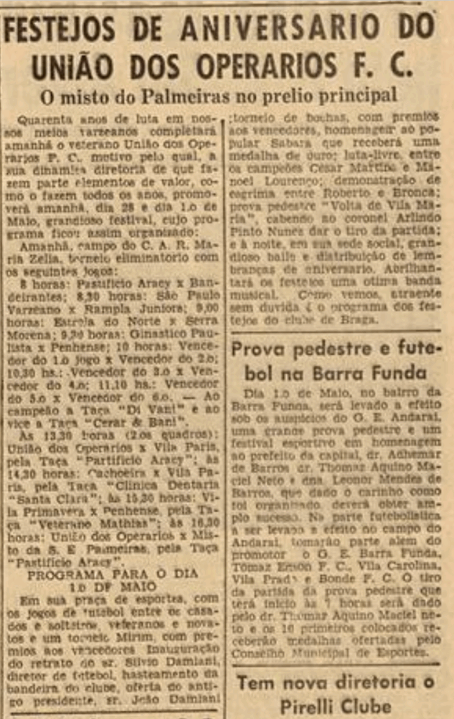 O Campeonato de 1934 marca a despedida do União dos Operários dos campeonatos organizados pelas diferentes Federações.